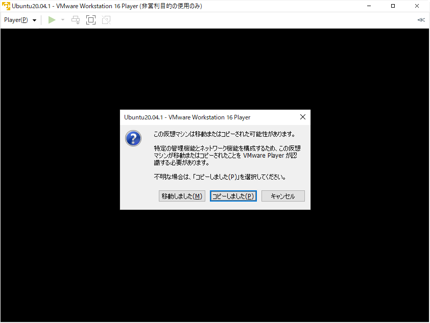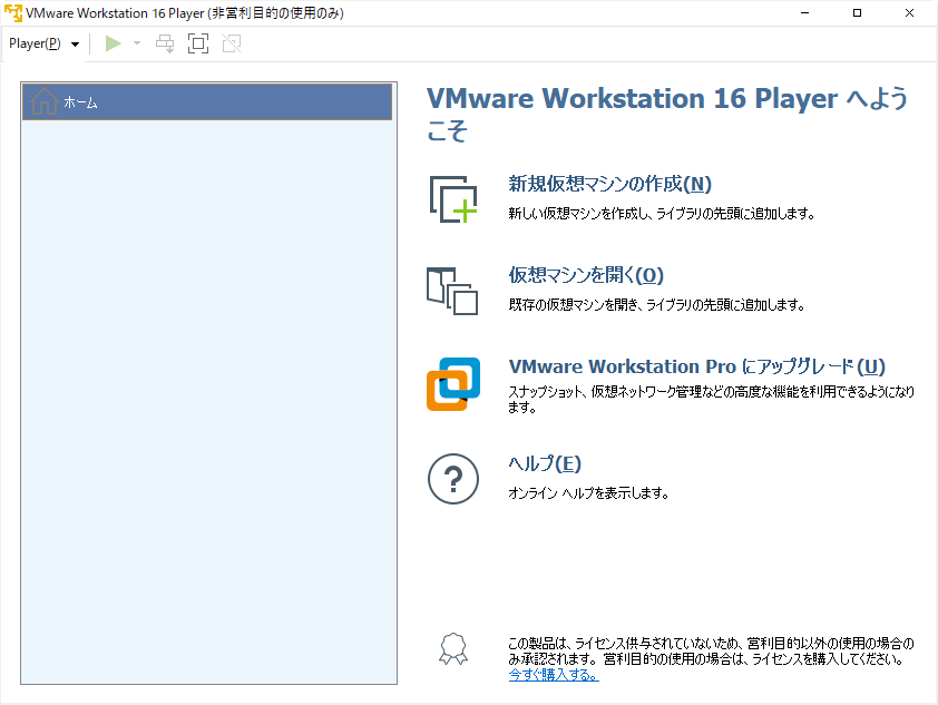 VMware Workstation Player を起動する。「仮想マシンを開く」を選択する。